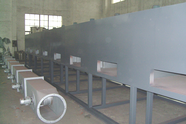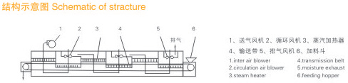 物料由加料器均勻地鋪在網(wǎng)帶上,網(wǎng)帶一般采用12-60目不銹鋼絲網(wǎng),由傳動裝置拖動在干燥機(jī)內(nèi)移動。干燥機(jī)由若干單元組成,每一單元熱風(fēng)獨(dú)立循環(huán),部分尾氣由專門排濕風(fēng)機(jī)排出,廢氣由調(diào)節(jié)閥控制,熱氣由下往上或由上往下穿過鋪滿物料的網(wǎng)帶完成熱量與質(zhì)量傳遞的進(jìn)程,帶走物料水份。網(wǎng)帶緩慢移動,運(yùn)行速度可根據(jù)物料溫度自由調(diào)節(jié),干燥后的成品連續(xù)落入收料器中。上下循環(huán)單元根據(jù)用戶需要可靈活配備,單元數(shù)量亦可根據(jù)需要選取。